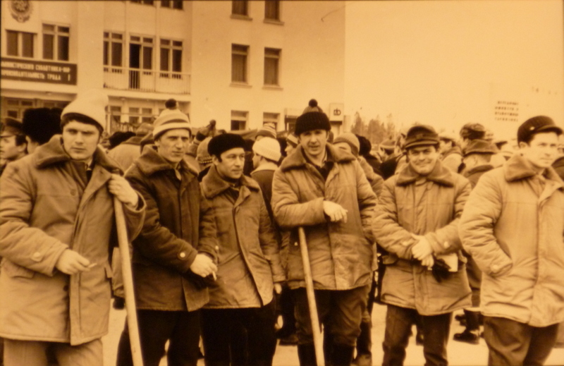 На субботнике возле Дома Офицеров во главе с Владимиром Ивановичем Ершовым, (крайний справа, зрит вдаль). Далее налево улыбающийся Миша Мурзин, автор, Толя Курчев, неизвестный и Миша Юнгов. Хорошо видно как Толя и здесь «бдит».
