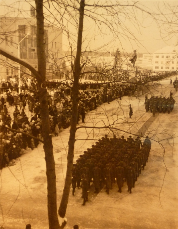 По всем «революционным датам» маршируем мимо Дома Офицеров с равнением на Идола. (Единственный раз удалось сачкануть от ненавистной муштры 7 ноября 1985 года. Фотографирую с балкона квартиры Милениных)