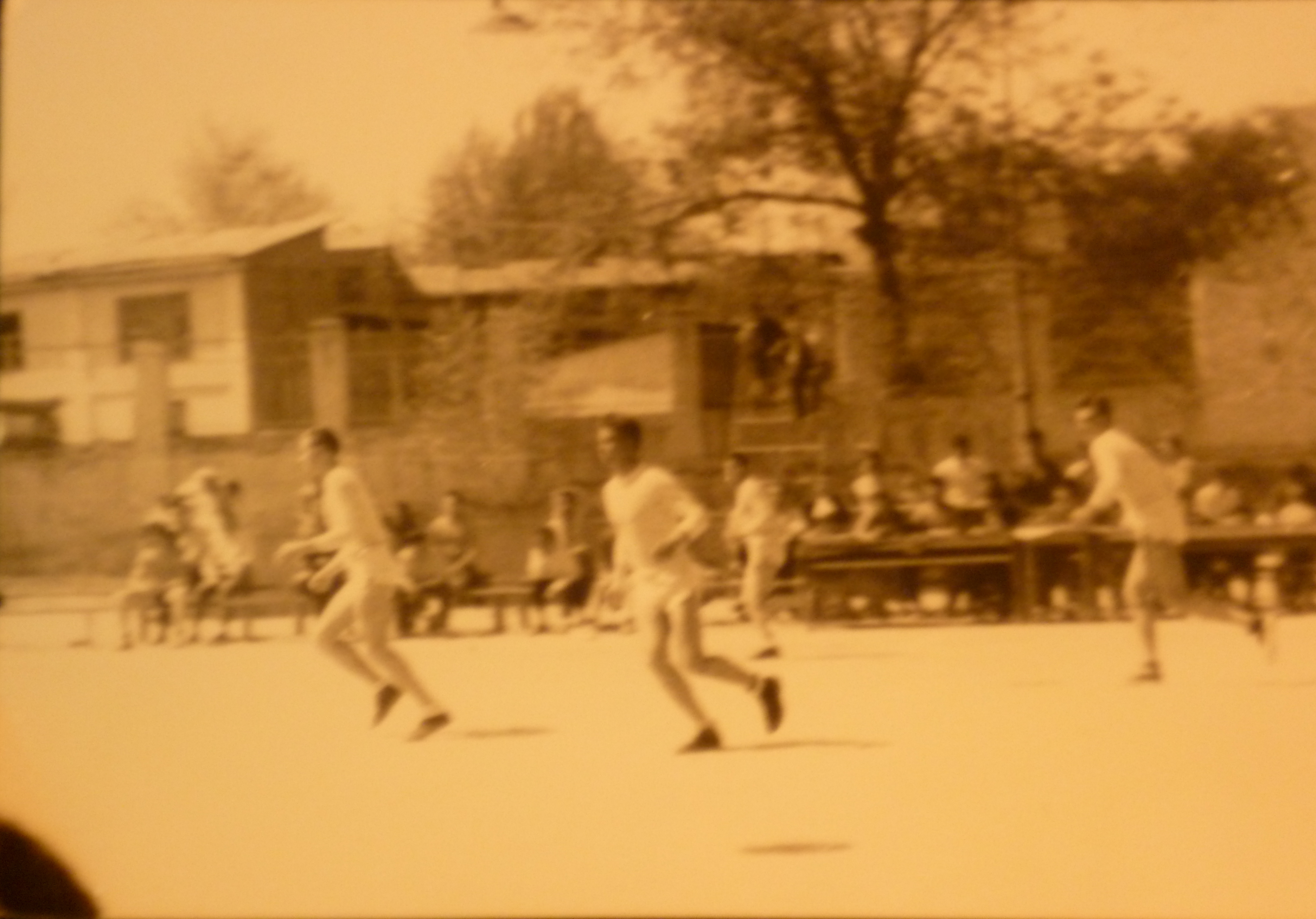 Ташкент. Атакует сборная Тюратама. В центре Саша Жмакин, за ним Коля Чернышов, крайний справа Юра Немыкин (наш забойщик), слева на фото бегу я.